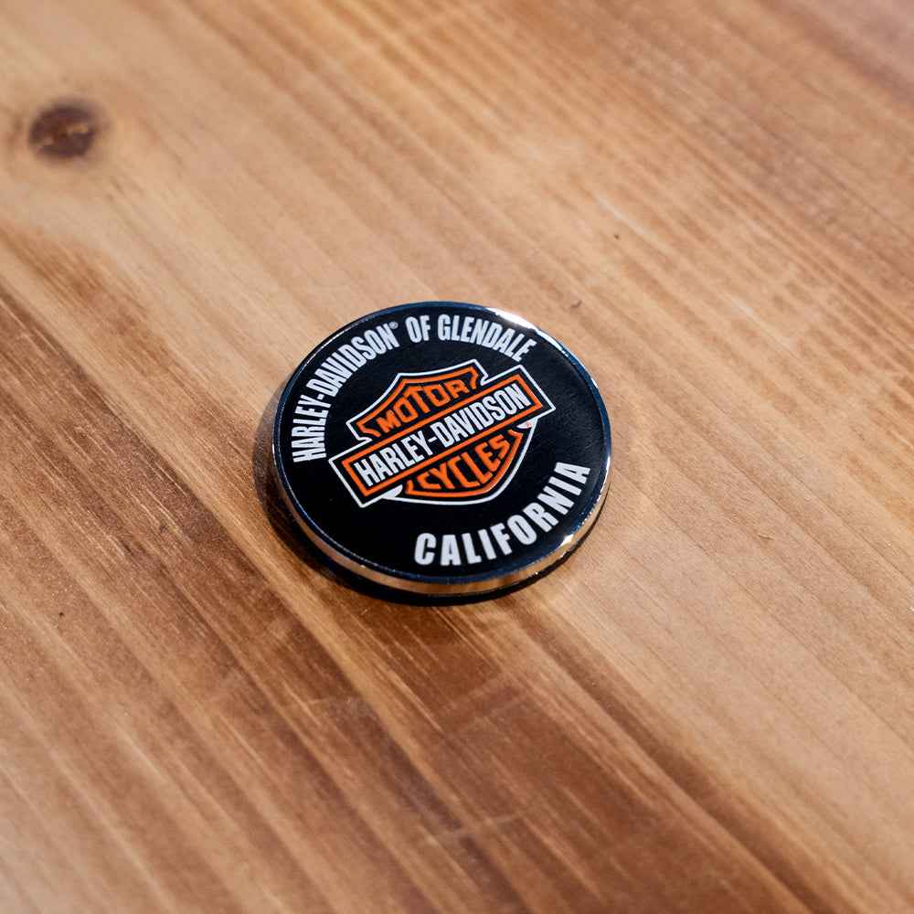 Harley-Davidson® of Glendale Decorative Magnet. Classic Bar & Shield logo on Black background with "Harley-Davidson® of Glendale California" in white wrap-around text.